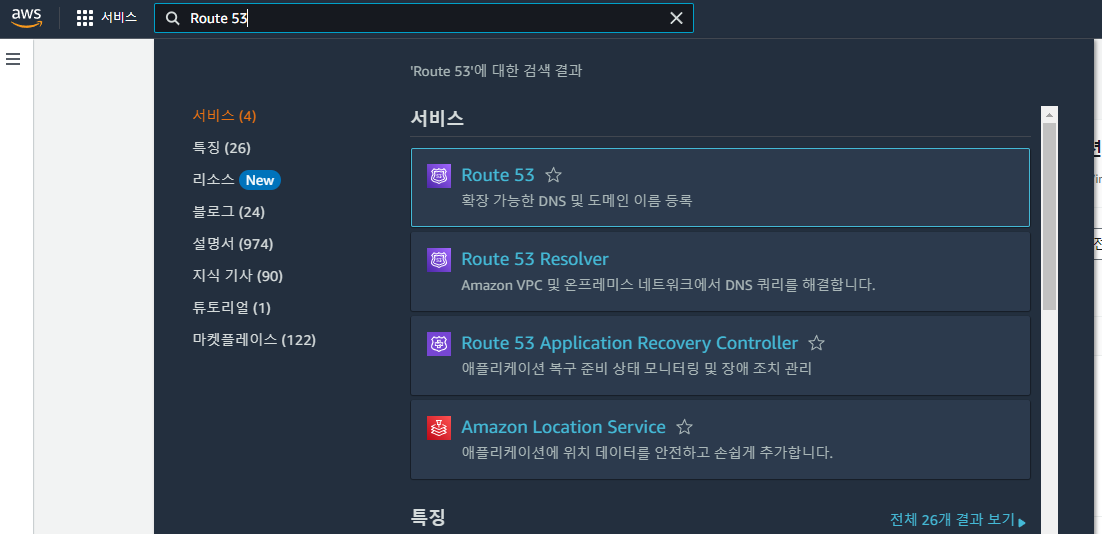 AWS 콘솔에서 "Route 53"를 검색하고 접속한다.