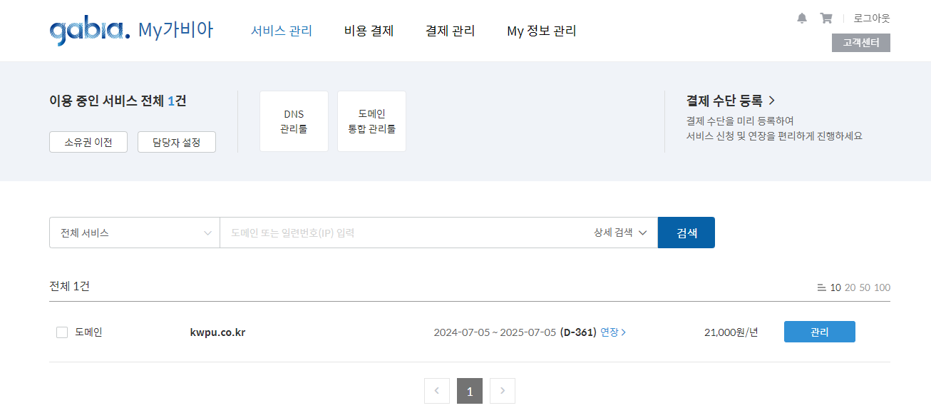 2-2 단계의 My-가비아 페이지로 다시 이동한 뒤, 구매한 호스팅 주소 우측의 "관리" 버튼을 클릭한다.