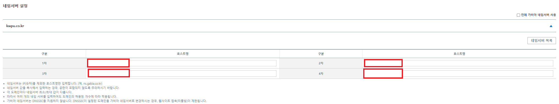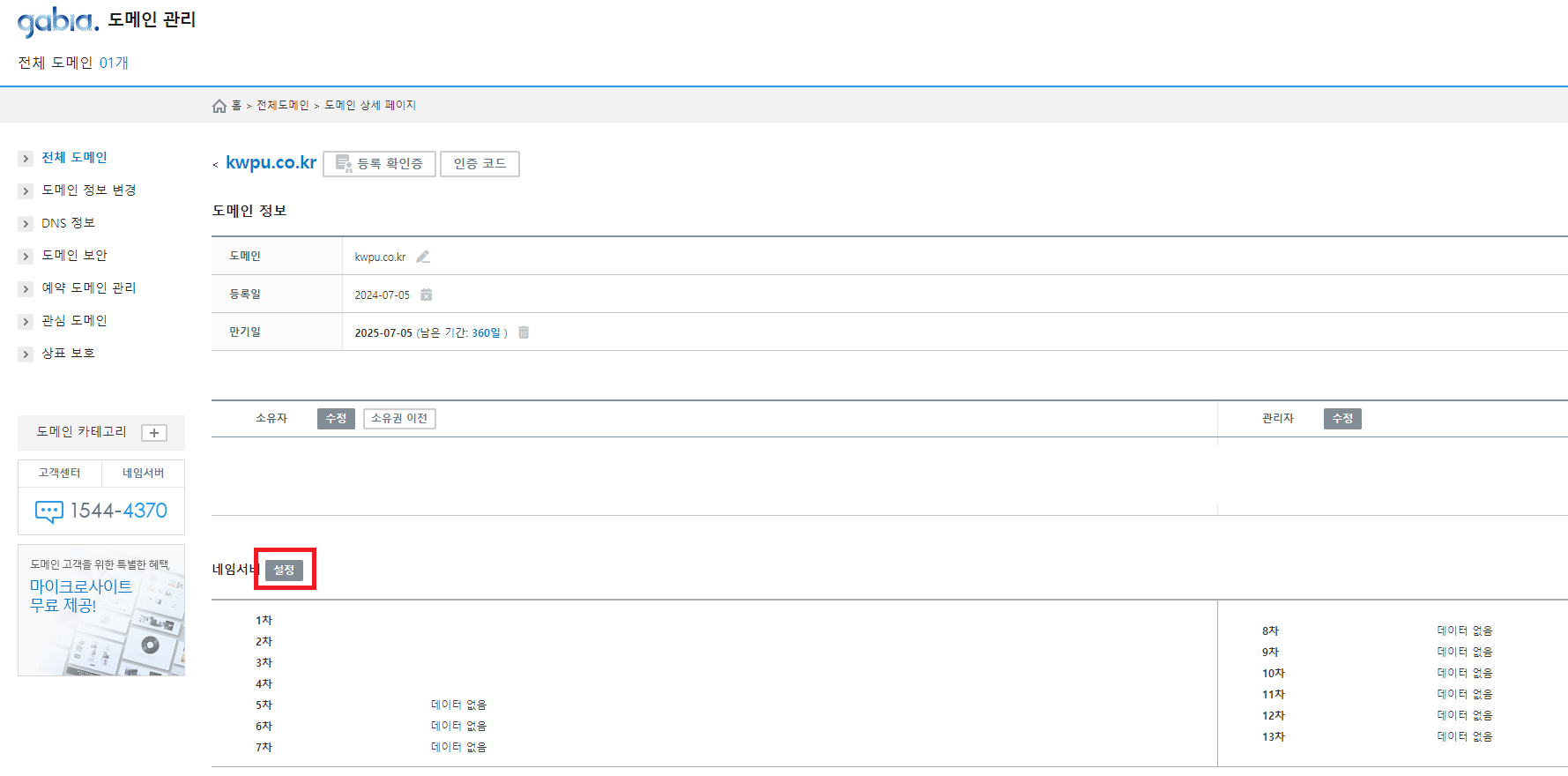 하단에 있는 "네임서버"의 설정 버튼을 클릭하여 들어간다.
